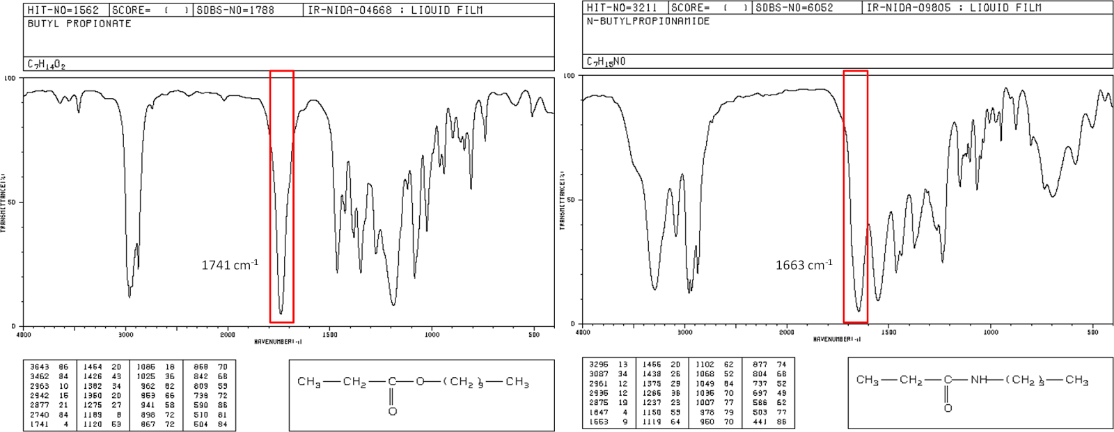 | Butyl propanoate (left) and N-butyl propanamide (right) |